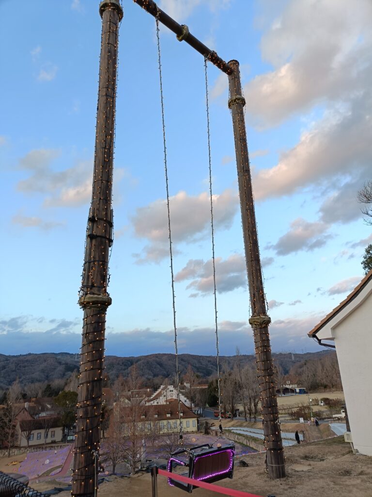 その後楽しんだのが、そり遊びとイルミネーション点灯後のブランコです。そり遊びは15分400円の有料でしたが、整備された急斜面を滑る形で、滑り台が大好きな3歳の子はとても楽しんでいました。